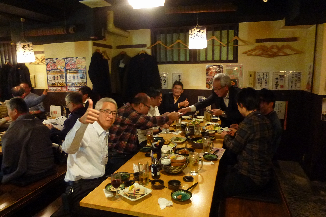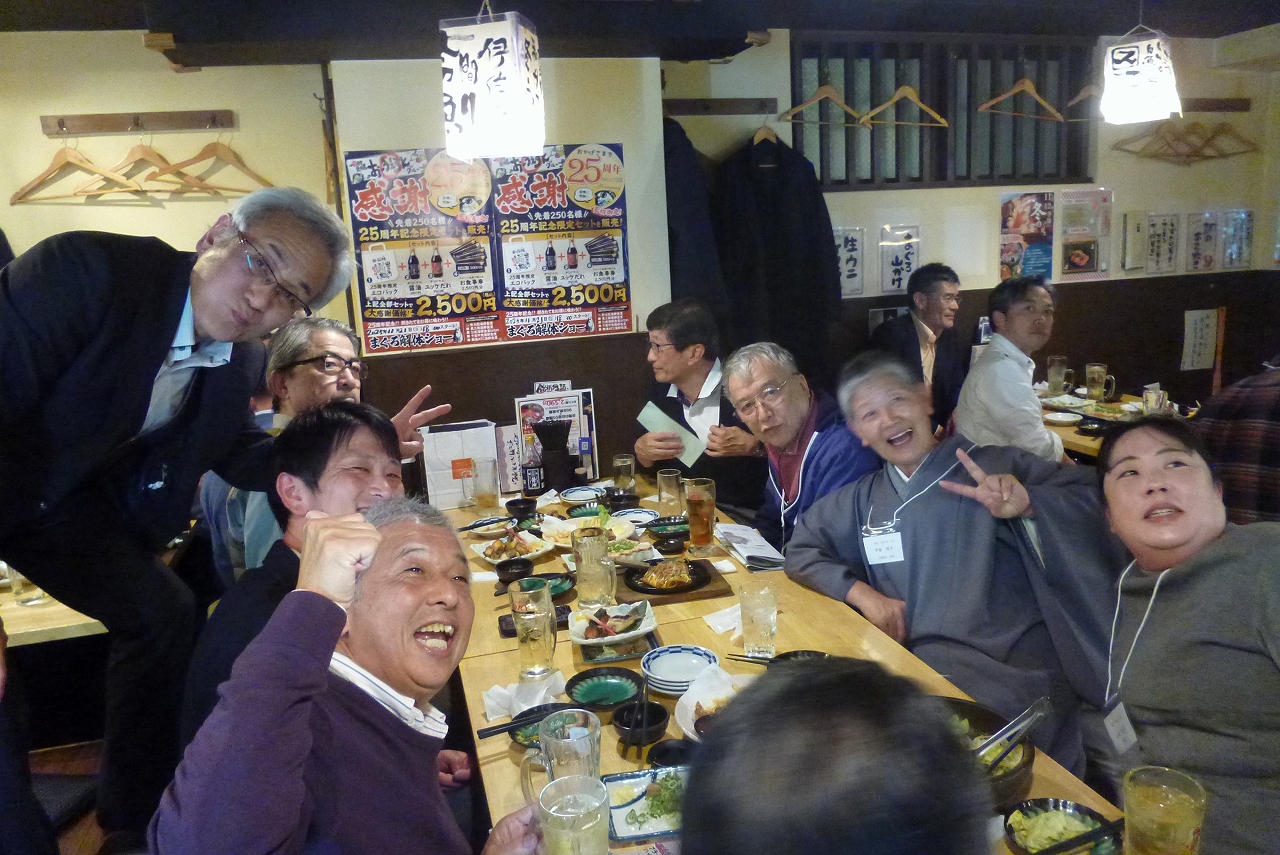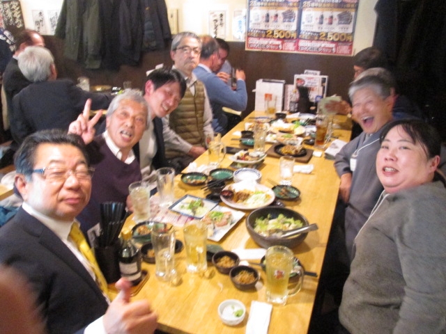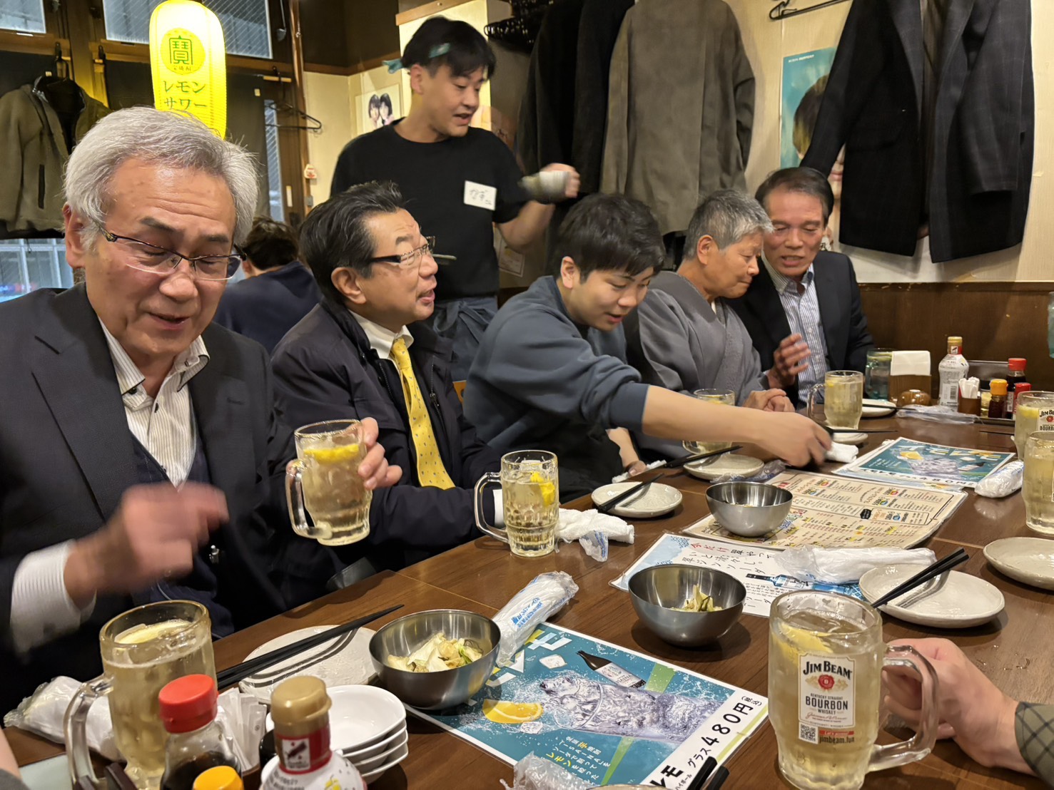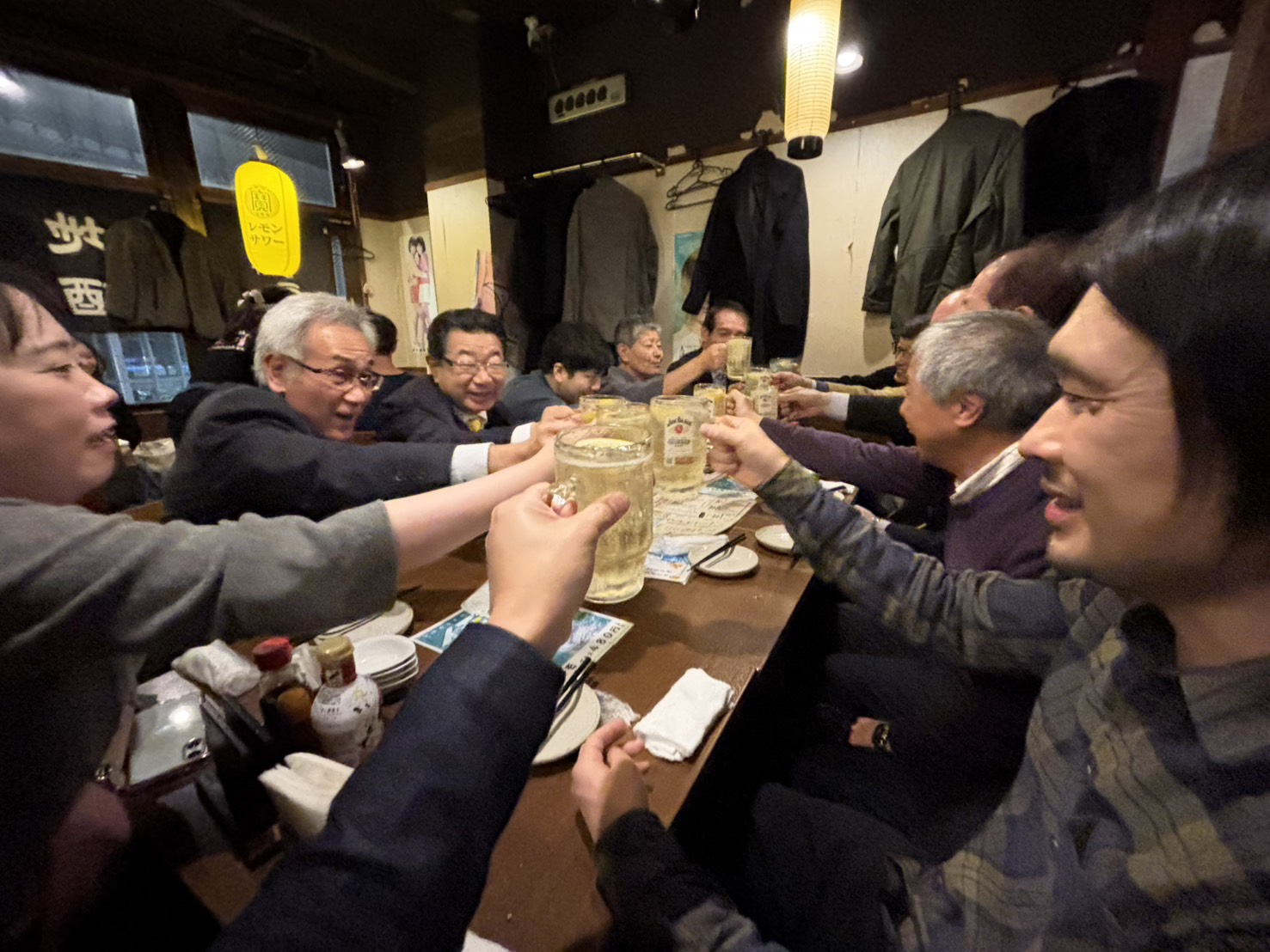 10名の席に12名で座り、肩を寄せ合ってハイボールを飲み交わしました。