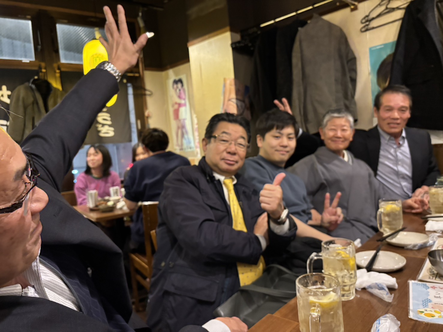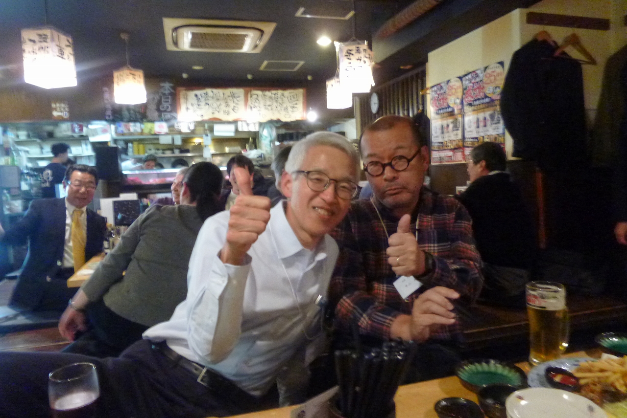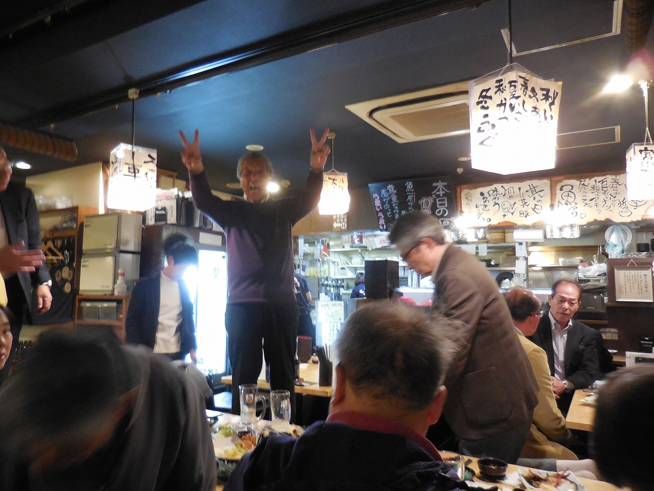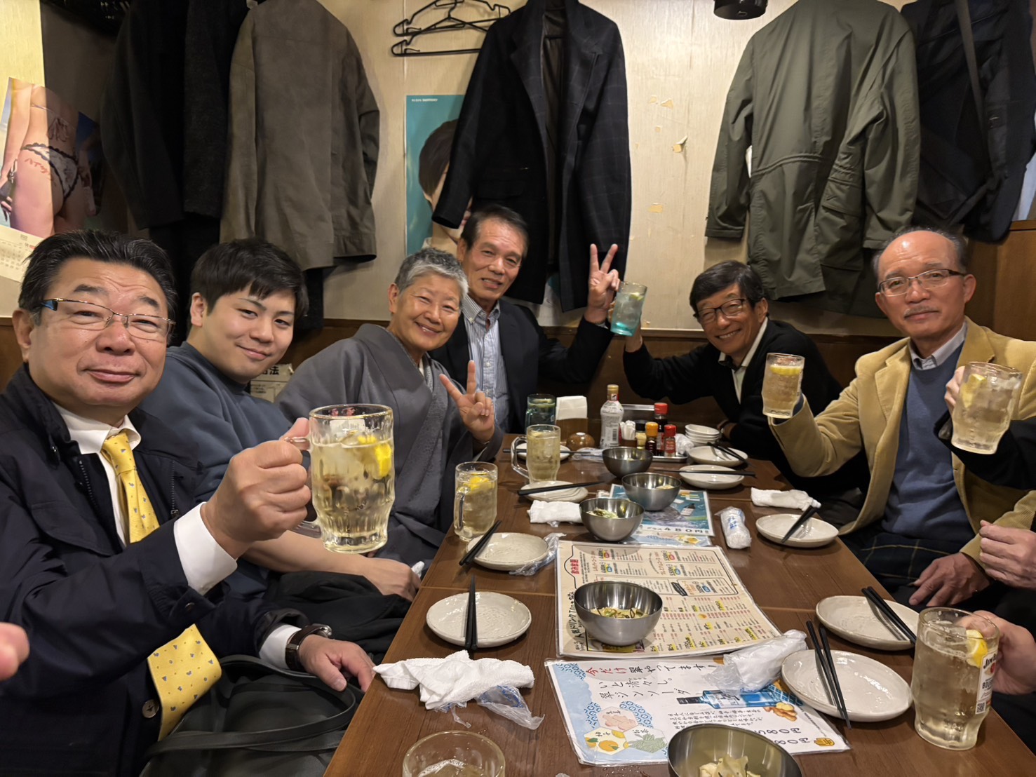 10名の席に12名で座り、肩を寄せ合ってハイボールを飲み交わしました。