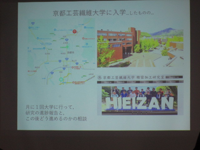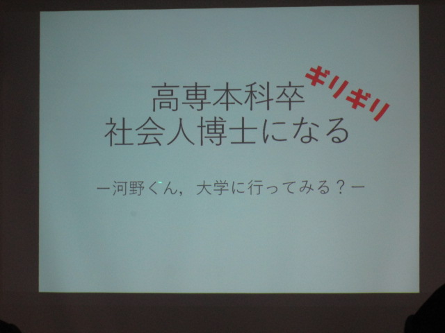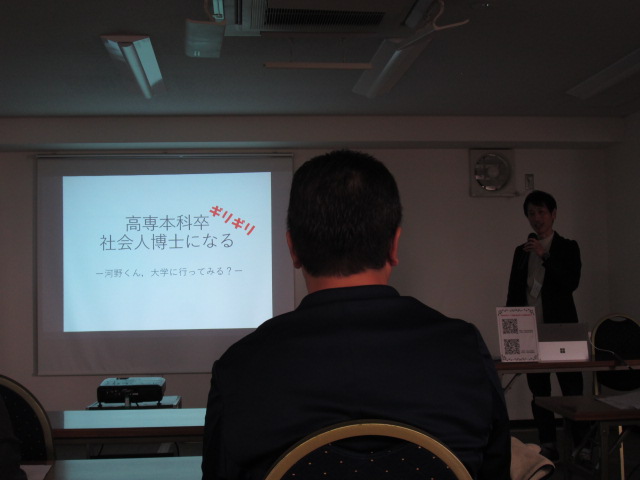 総会終了後、恒例の卒業生講演は株式会社カシフジの河野さん(高専・機械43期)が「高専本科卒、ギリギリ社会人博士となる」の演題で会社に勤務しながら京都工芸繊維大学大学院に進学し、仕事と大学での研究を両立させながら難関の博士(工学)を取得した素晴らしい体験を講演していただきました。